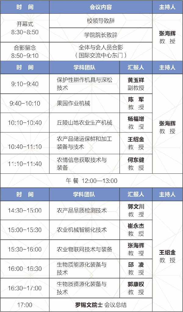bt365体育在线官网学科团队发展汇报会将于2017年12月22日在西北农林科技大学国际交流中心210举行。本次会议将邀请bt365体育在线官网学术院长罗锡文院士现场指导保护性耕作机具与深松技术、果园作业机械、丘陵山地农业生产机械、农产品储运保鲜和加工装备与技术、农情信息获取技术与装备、农产品品质检测技术、农业机械智能化技术、农业物联网技术与装备、生物质能源化装备与技术、生物质资源化装备与技术等10个研究领域的科研进展汇报,旨在探讨旱作农业机械与装备、精准农业关键技术与装备、生物质综合利用等学科的技术发展难题,推动学校相关学科及关键技术合作等方面协同创新发展。